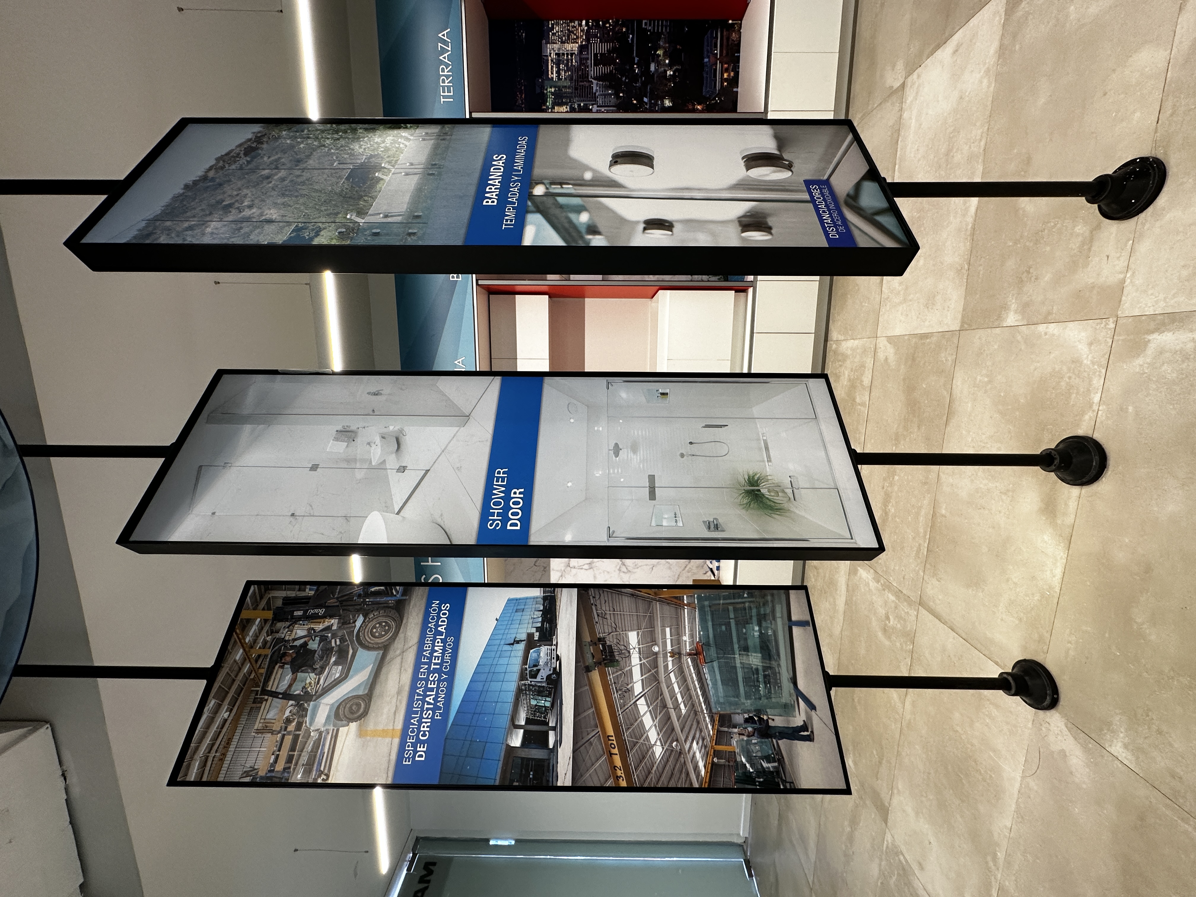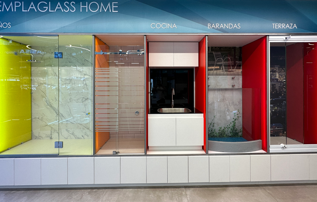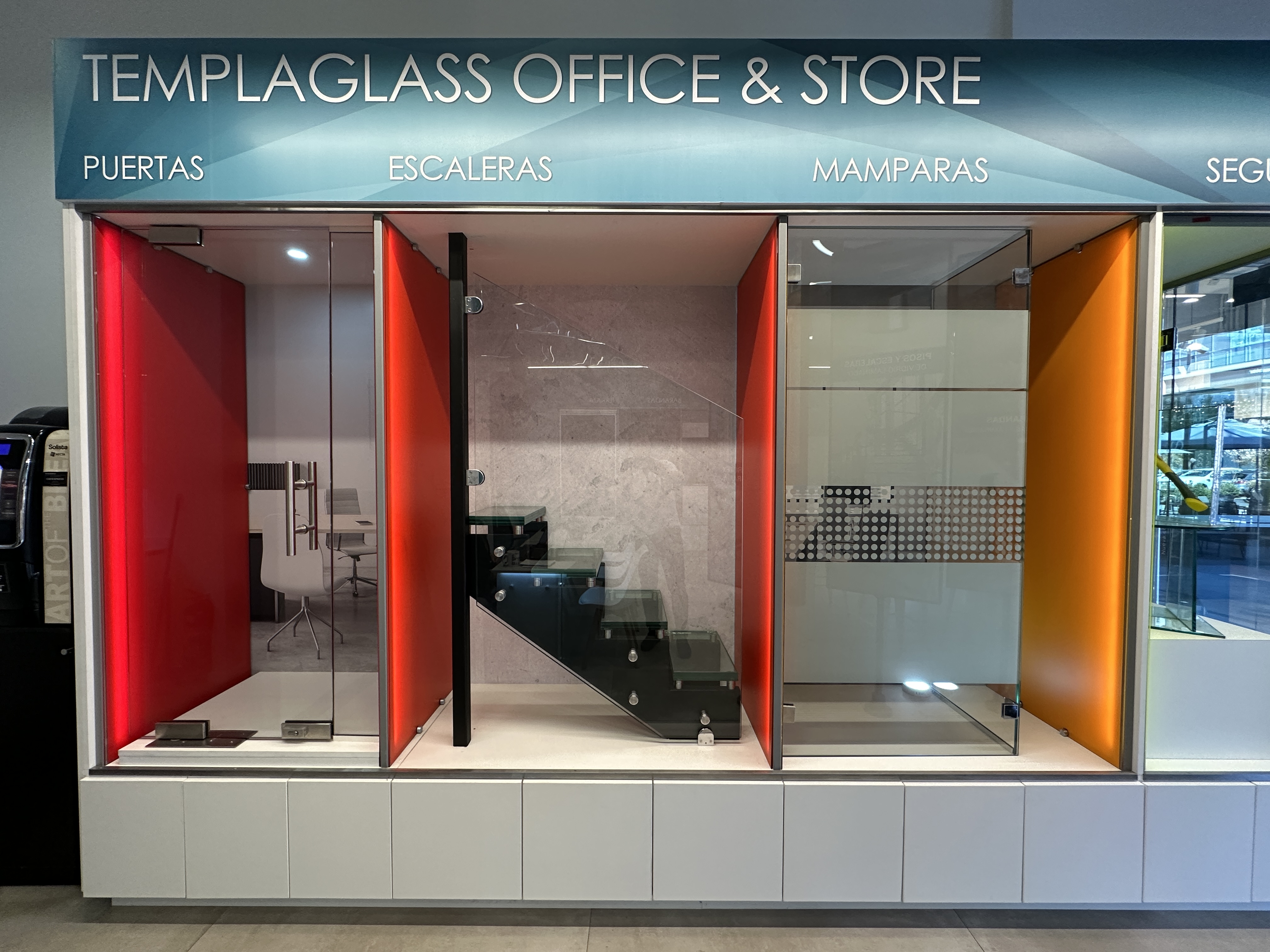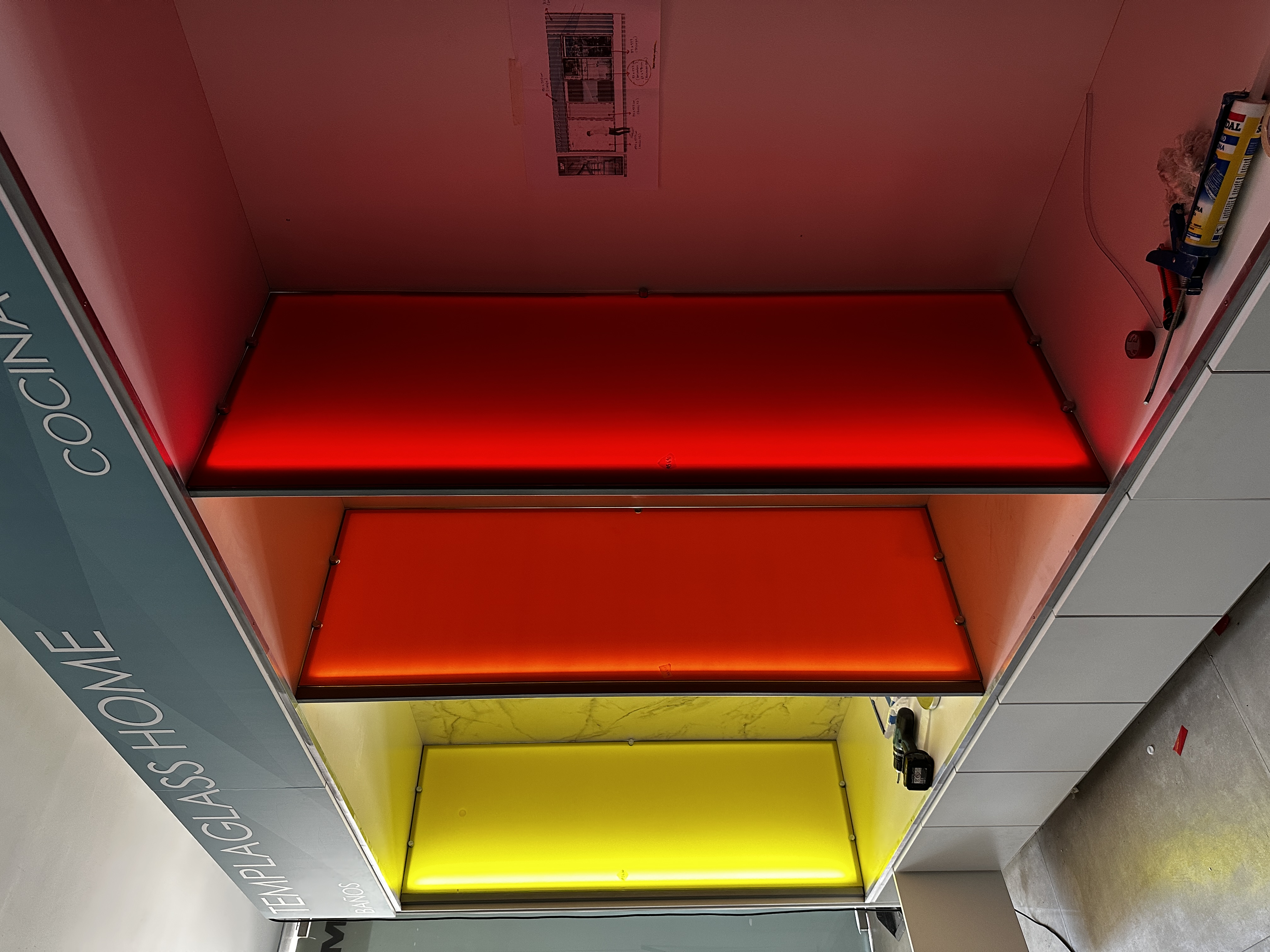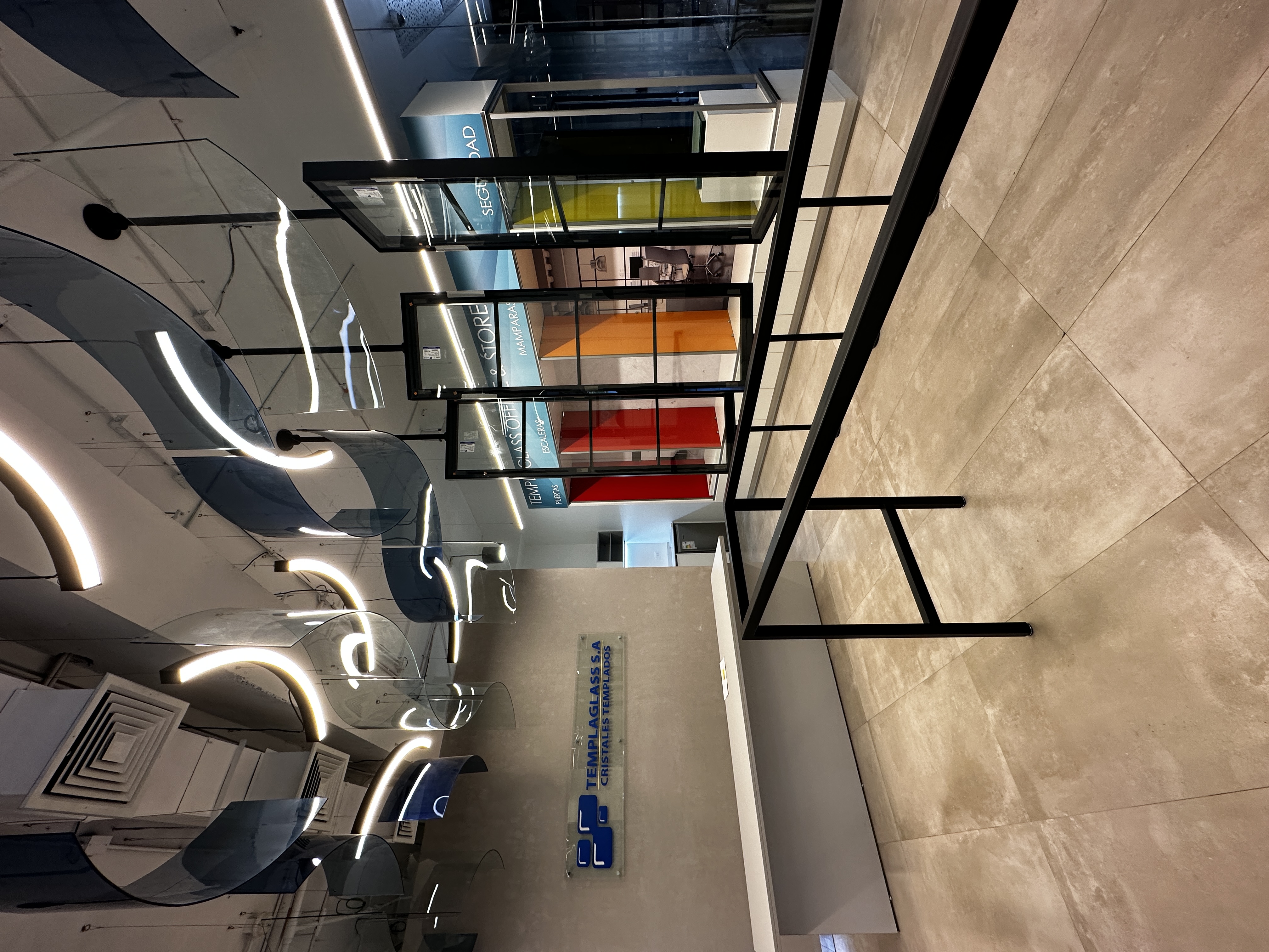Diseño y construcción de showroom en el que diseñamos mobiliario con elementos vdriados especiales, curvando y aplicando color a cristales como elementos protagonistas del espacio.