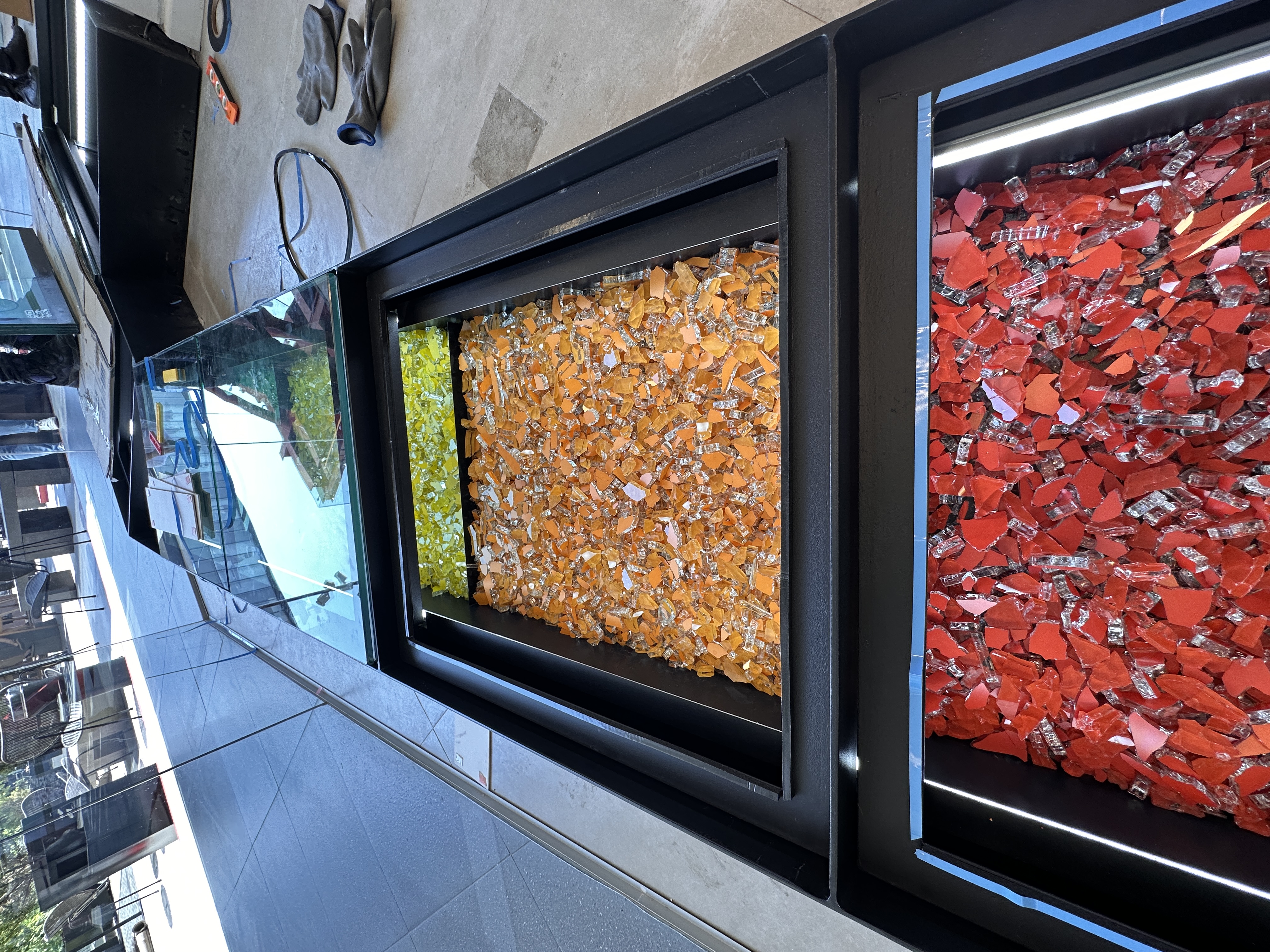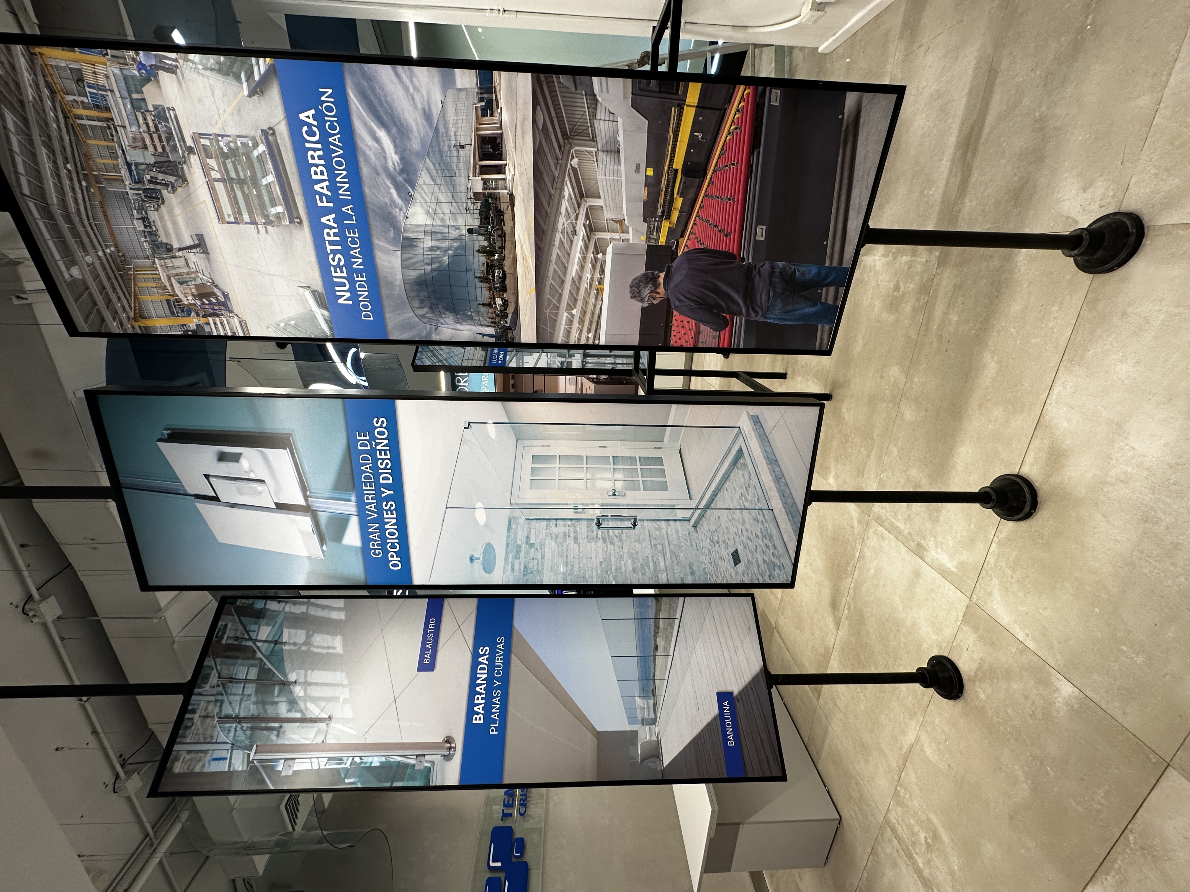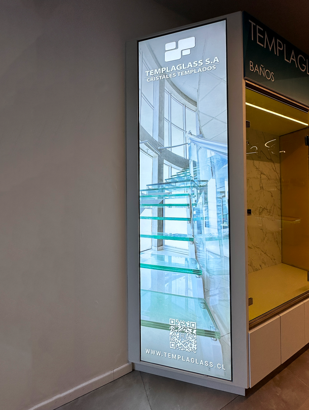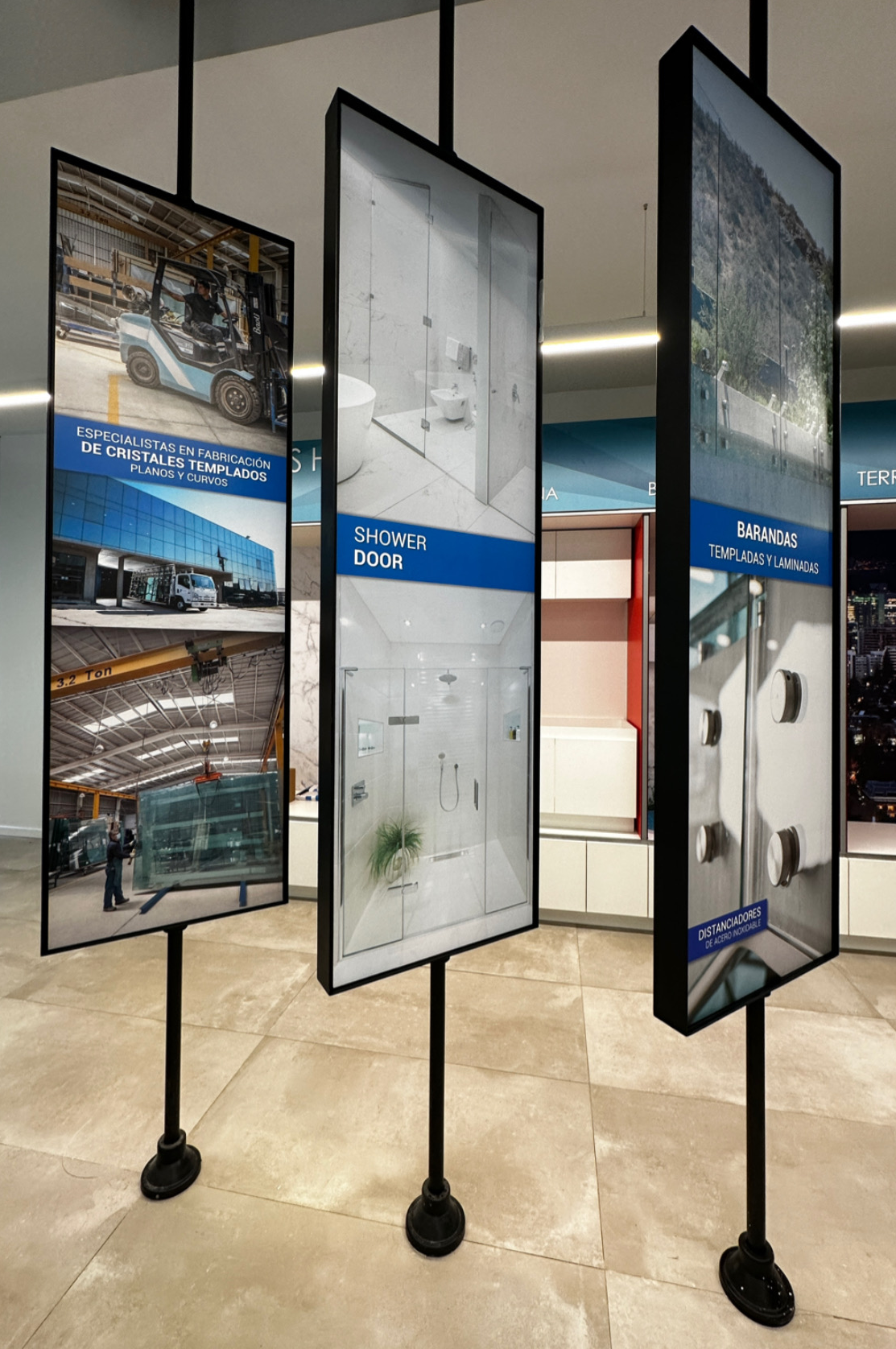 Diseño y construcción de showroom en el que diseñamos mobiliario con elementos vdriados especiales, curvando y aplicando color a cristales como elementos protagonistas del espacio.